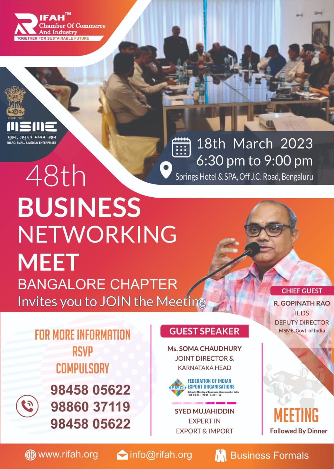 | Description | Bengaluru, Karnataka – Rifah Chamber of Commerce and Industry Bangalore Unit of Karnataka Chapter recently hosted a successful Business Networking Meet on March 18, 2023, at Spring Hotel Bangalore. The event was attended by a total of 65 participants who engaged in various discussions on the latest trends and developments in the business world. The event was graced by several eminent personalities, including R. Gopinath Roa, IEDS, Deputy director MSME Govt. Of India, Ms. DM Danisha Minu, Deputy Director FIEO, Karnataka, Jb Syed Mujahideen sb African expert in Export & export, JB Firoz sb Secretary Karnataka RCCI, jb Akhtar sab president, jb Habib sab, Jb Arifulla sab, jb Vaqas sb Bengaluru unit,Jb Hasnuddin Sab RCCI President Raichur and other guests. The program was designed to provide a platform for businesses to network, exchange ideas, and forge new partnerships. Participants had the opportunity to engage with the speakers and learn about their experiences in the industry. The Chief Guest, R. Gopinath Roa, Deputy director MSME Govt. Of India, spoke about the government’s initiatives to support small and medium-sized enterprises and how businesses can leverage these programs to grow and expand. Ms. DM Danisha Minu, Deputy Director FIEO, Karnataka, emphasized the importance of international trade and how businesses can benefit from exporting their products to other countries. Jb Syed Mujahideen sb, an African expert in Export & export, shared his insights on the African market and how businesses can tap into the continent’s vast potential. The event concluded with a vote of thanks from Jb Firoz sb, Secretary Karnataka RCCI, who expressed his gratitude to all the participants and speakers for making the event a success. Overall, the Business Networking Meet was a great success, providing a valuable platform for businesses to network, learn, and grow. |