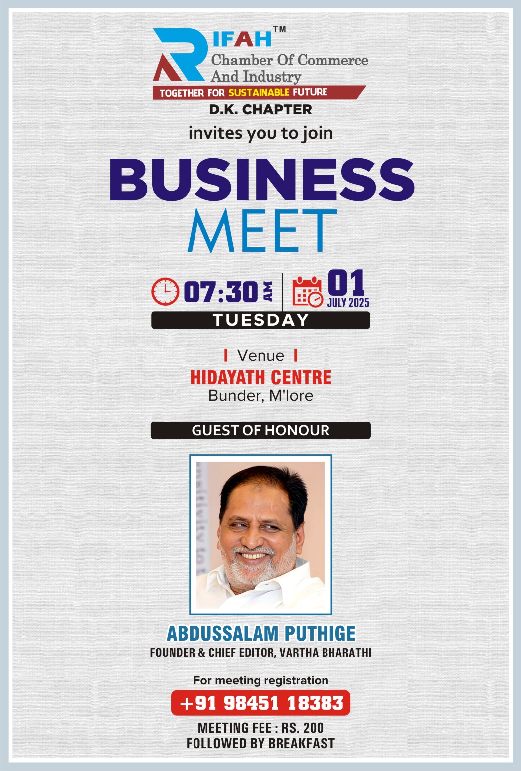 BUSINESS MEETTIme: 07:30 AMDate: 01 JULY 2025 TUESDAYVenue I HIDAYATH CENTRE Bunder, M'lore