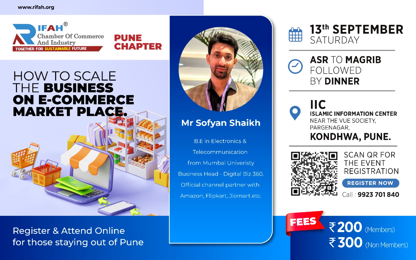 | Description | RCCI Pune Business Session – Learn to Scale on E-Commerce Platforms Rifah Chamber of Commerce & Industry (RCCI Pune) invites you to an insightful session on building and scaling your business on leading commerce platforms. 🗓 Date: 13th September 2025 (Saturday) 🕌 Asr, Magrib & Esha Salaah arrangements at the venue 🎙️ Speaker: 👔 Dress Code: Formal Business Attire 💵 Fees: 🔗 Register Now: 📞 For Details, Contact: 📦 Take your business to the next level with e-commerce expertise. |