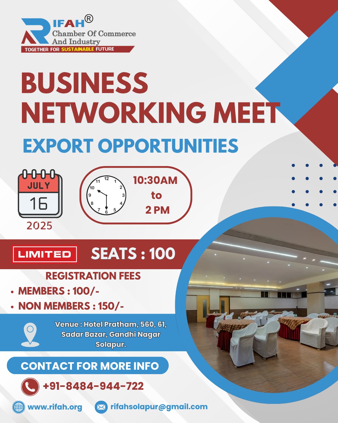 | Description | RIFAH BUSINESS MEET – SOLAPUR Tazkeer Your Network is Your Networth Business Opportunities in African Countries Rifah’s Role in Your Business Scale-up QnA and Networking Wednesday, 16th July 2025 Registration Fees: ₹150 For Queries: Aaftab Patel – 8484944722 |