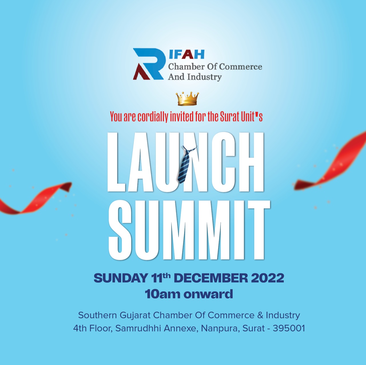 Venue Southern Gujarat Chamber of Commerce and Industry Hall in Nanpura.