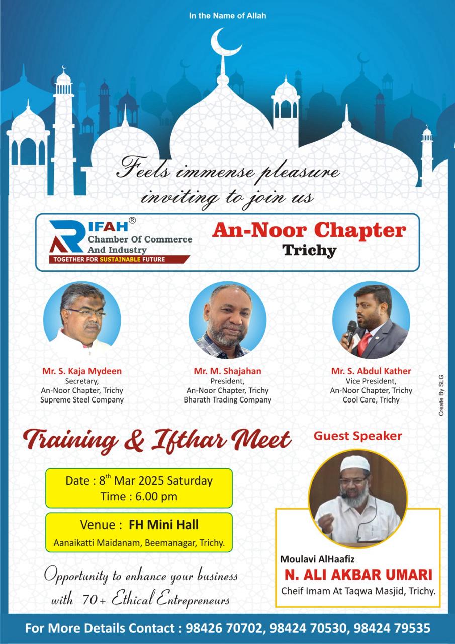 | Description | Training & Iftar Meet Date: 8th March 2025, Saturday Guest Speaker: An opportunity to enhance your business with 70+ ethical entrepreneurs. For More Details Contact: |