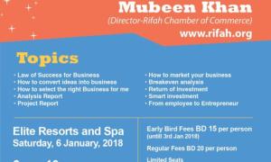Indian Welfare Association W.L.L hosted a Business Summit – Business Startup in India at the Summit Hall of Elite Resort & Spa in Muharraq, Bahrain on 6th January, 2018. Mr. Mubin Khan, member of core committee of Rifah Chamber of Commerce and Industry was invited to speak on the Business Startup opportunities in India. The programme was attended by 75 people.