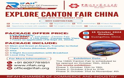 Explore Canton Fair China with Rifah Chamber of Commerce and Industry Join us for an exclusive visit to the 136th Canton Fair, along with a Yiwu Market visit Date: 15th October 2024 onwards Location: Guangzhou, China Why Canton Fair? – Access to a wide