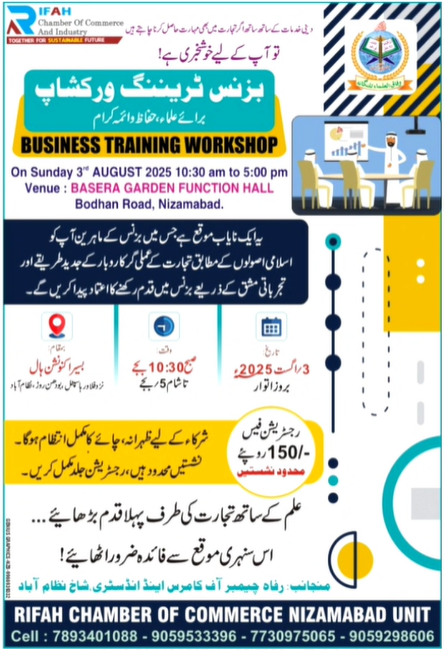| Description | 🌟 اہم اعلان برائے علماء، حفاظ و ائمہ کرام! ضلع نظام آباد 🌟 رفاہ چیمبر آف کامرس اینڈ انڈسٹری تلنگانہ "بزنس ٹریننگ ورکشاپ برائے علماء ، حفاظ و ائمہ اکرام" یہ ایک نایاب موقع ہے جس میں بزنس کے ماہرین آپ کو 📈 اسلامی اصولوں کے مطابق تجارت کے عملی گر 📊 کاروبار کے جدید طریقےاور 🛠️ تجرباتی مشق کے ذریعے بزنس میں قدم رکھنے کا اعتماد پیدا کریں گے۔
