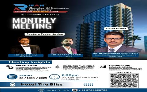 | Description | Alhamdulillah! The Rifah Chamber of Commerce and Industry – Hubli Chapter successfully conducted its Business Meeting for the month of November on 28th November 2025 at The Bliss Hotel, Hubli. The meeting commenced with a soulful Tilawat-e-Quran by CA Ahmed Ayaz Faizabadi, followed by a warm Welcome Address delivered by Mr. Mohammad Tariq Mujahid. The session was smoothly anchored by Mr. Mohammad Dawood Sheikh, who served as the host for the evening. A brief Member Introduction Round was held, where all attendees introduced themselves along with their respective businesses. Two insightful Feature Presentations were delivered by: An engaging session was then taken by the Chief Guest: who shared valuable insights from his professional journey. After his address, a momentous was presented to him as a token of appreciation. Following this, the special guests from News Trail * Mr. Maqbool Ahmed Siraj also introduced themselves and briefly spoke about News Trail and its work, adding value to the session. The Vote of Thanks was delivered by Mr. Yunus Kadkol, expressing gratitude to all members, presenters, and guests. State Vice President: Mr. Md. Tariq Mujahid The meeting witnessed an active participation of approximately 40–45 members, reflecting the steady growth and collective commitment of the Hubli Chapter. – Team Rifah, Hubli Chapter |