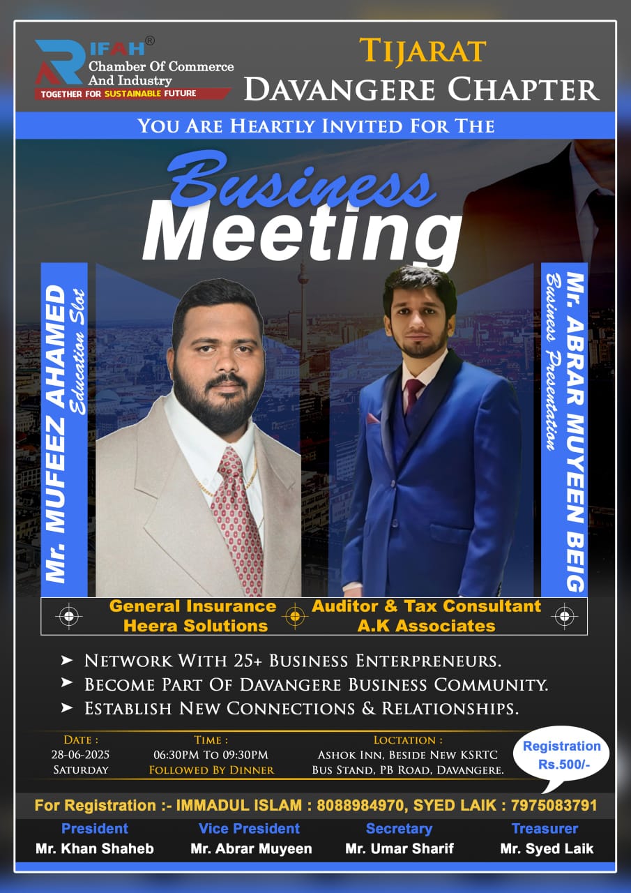 | Description | Rifah Davangere Tijarat Chapter – Weekly Business Meeting We are delighted to invite you to the Rifah Tijarat DVG Chapter Business Meeting — an exclusive platform for professionals and entrepreneurs to connect, collaborate, and grow their businesses. Topic: Business Networking Weekly Meeting Reserve Your Seat: Registration Link Last Date for Registration: 27th June 2025 For Registration Contact: 8088984970 Event Highlights: