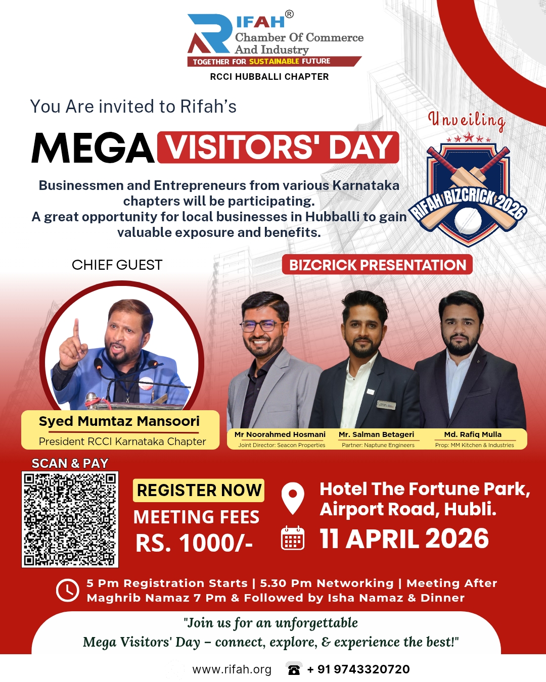 | Description | β¨ *Mega Opportunity for Business Growth*π RIFAH Chamber of Commerce and Industry Hubballi Chapter invites you to its *Mega Visitor's Day*β π Date: *11th April 2026* βTime: *05:00 PM onwards* π Venue: *Hotel The Fortune Park, Airport Road, Hubli* π€ Connect | Collaborate | Grow π€ Chief Guest: *Syed Mumtaz Mansoori* π *BizCrick 2026 Presentation* πΌ A great platform to gain visibility, network with industry leaders, and explore new opportunities. π° Meeting Fees: βΉ1000/- π *Limited seats β Register Now! |