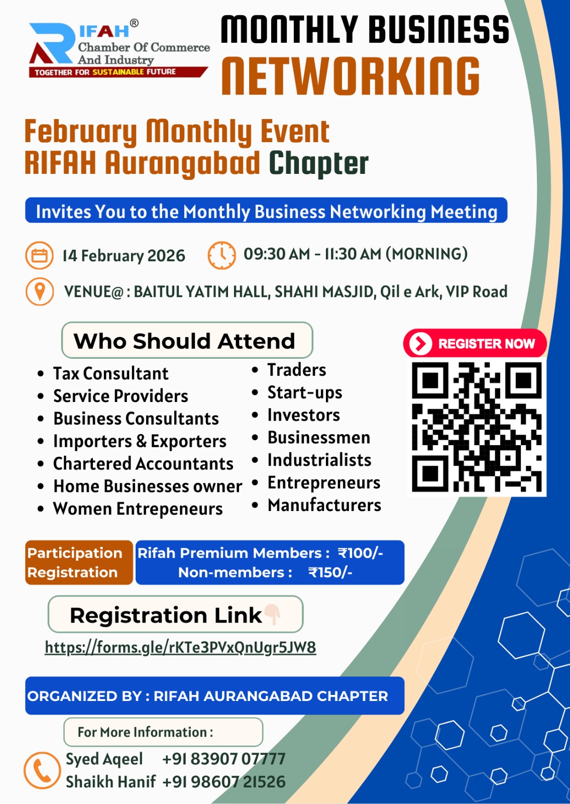 | Description | π RIFAH AURANAGABAD BUSINESS NETWORKING MEET π π Saturday 14 Feb 2026 | π 9:30 β 11:30 AM | πBaitul Yateem Hall, Shahi Masjid Networking Meet session for: π Registration Link: π³ Fees: βΉ100 (RIFAH Members) | βΉ150 (Non-members) π’ Organized by Rifah β Aurangabad Chapter π Info: |