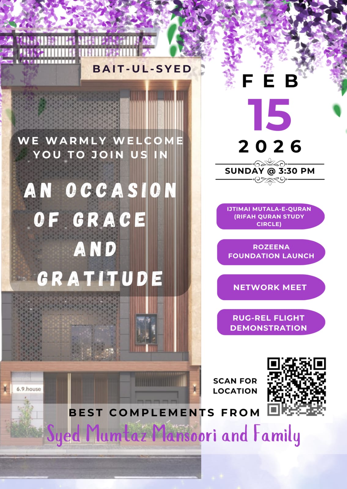 | Description | Personal Invitation from the State President On the Occasion of the Grace and Gratitude of his House-warming Ceremony and on Coming Sunday Evening 15th Feb 2026 in Davanagere at his residence We are pleased to invite you on behalf of our State President, Syed Mumtaz Mansoori Sb for his 1) Business Networking Meet of RIFAH Karnataka 2) Launching of Rozeena Foundation Charitable Trust 3) Launch The RIFAH Quran Study Circle 4) Demonstration of Rug-Rel Aircrafts live flight Our State President has personally requested all state leadership team from all chapters to attend this half day engagement without fail. Hotel accommodations for all have been arranged on behlf of our State President If other members would like join the occasion they are most welcome. However we sincerely solicit the earlier intimation to make the necessary arrangements. We request members from all chapters to attend Business meet and other Launching programmes & also Grace occassion of Home warming ceremony. Regards |