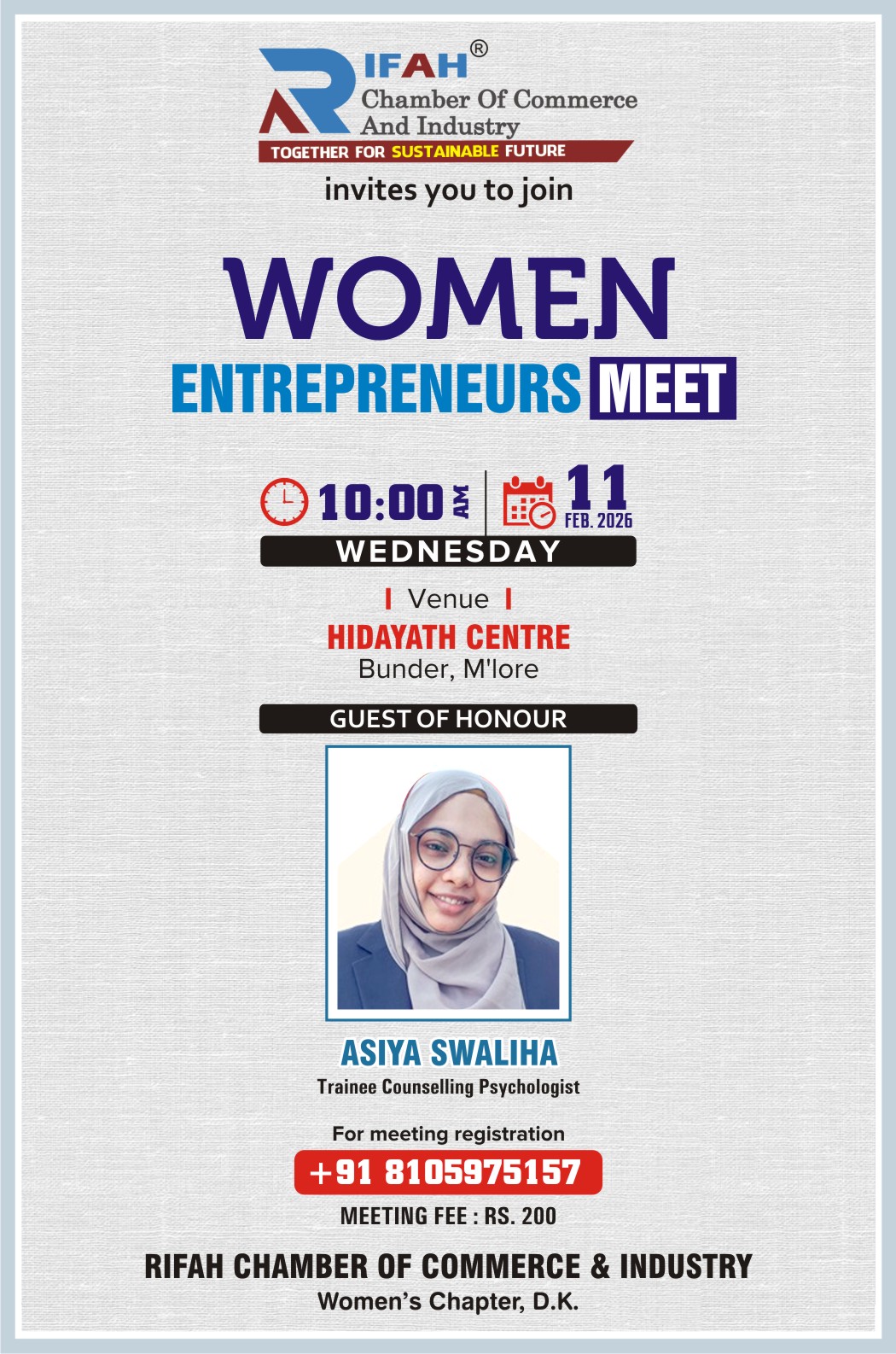 | Description | Rifah Chamber of Commerce & Industry β Womenβs Chapter, D.K., cordially invites women entrepreneurs, professionals, and aspiring business leaders to attend the Women Entrepreneurs Meet. π