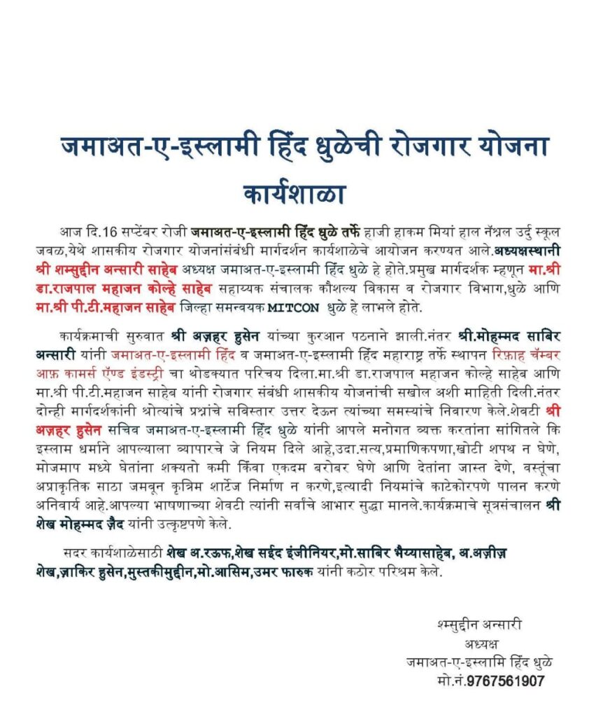Rifah Chamber of Commerce organized-Rozgar Schemes Workshop on 16th Septmber 2018 in Haji Hakam Miyan Hall, Near National Urdu School. Dhule Maharashtra. 120 people attended this program
