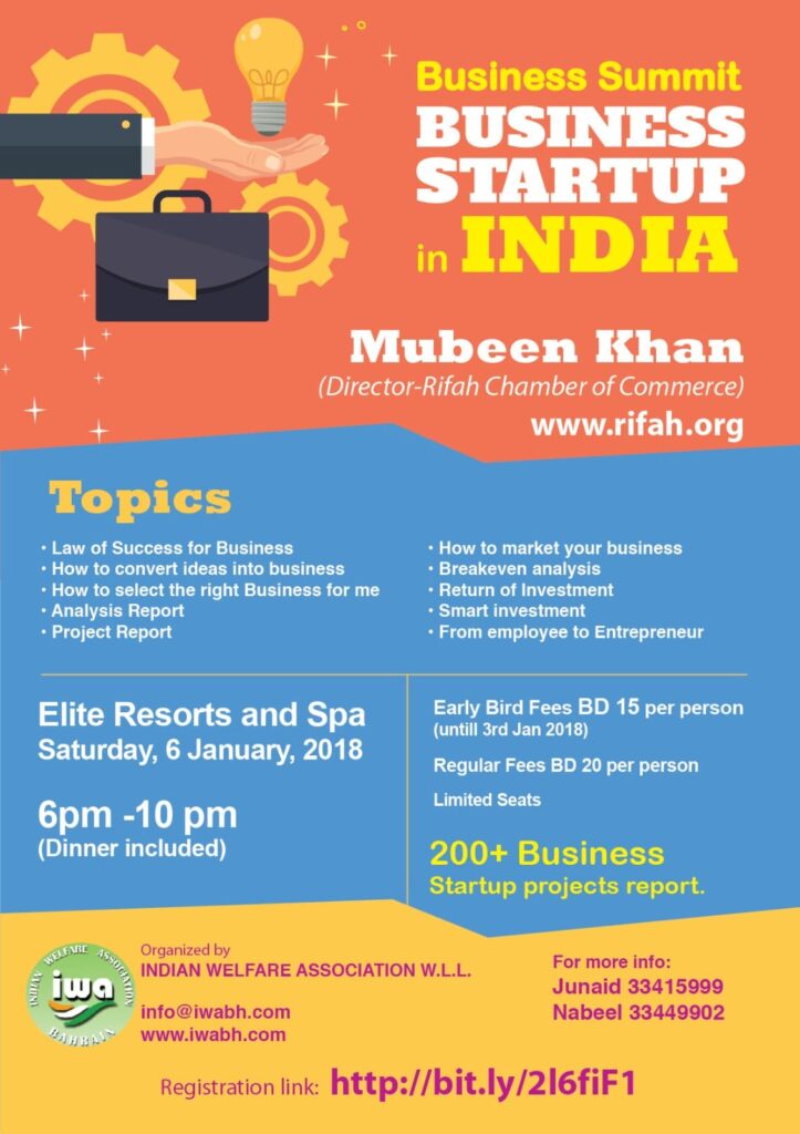 Indian Welfare Association W.L.L hosted a Business Summit – Business Startup in India at the Summit Hall of Elite Resort & Spa in Muharraq, Bahrain on 6th January, 2018. Mr. Mubin Khan, member of core committee of Rifah Chamber of Commerce and Industry was invited to speak on the Business Startup opportunities in India. The programme was attended by 75 people.