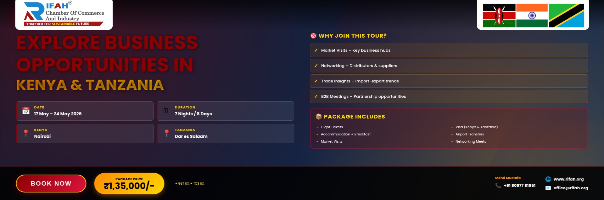 | Description | 🌍✨ EXPLORE BUSINESS OPPORTUNITIES IN KENYA & TANZANIA ✨🌍 📅 Date: 17 May – 24 May 2026 🔹 Why Join This Business Tour? 🎯 Package Includes: 💰 Package Price: USD 1,470 (₹135,000/-) Per Person EXTRAS (Mandatory): 📝 Important Notes: 📩 Register Now: 📞 For More Details: |